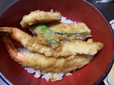 ★朝から天丼です。実は、昨日のお昼、うーがと寿司ランチを食べました。にぎりの他に、茶碗蒸し、赤だし、デザートがついていたので、天ぷらはテイクアウトしました。それを使っての天丼です。 当然、二人前あります。 おつゆかわりの野菜スープは、少しずつ残っていた白菜、キャベツ、セロリ、それに新たま、ベ…