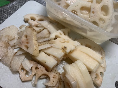 ★今朝は、野菜のストックおかずをこさえました、レンコン、半分は酢レンコンに、半分は剥いた皮もいっしょにキンピラにしました。 乾燥ゴボウやニンジンも入れました。 切干大根は、油揚げ、竹輪と炊きました。豚汁に使ったさつまいもの残りは、含め煮にしました。 レタスとセロリ菜は洗って容器…