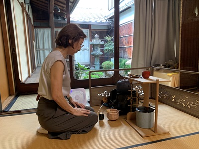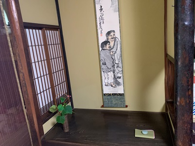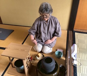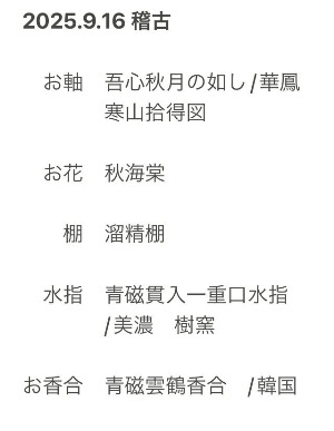 ひよこ組のわたしたちと少し遅れて、ベテランのスノウ(雪)さんと、すくすく(育々)さんが入室されると、茶室が一変します。蹲での身の清め、お床拝見、師へのご挨拶を含め、ふるまいの流れの美しさから始まって、お作法にうっとりします。