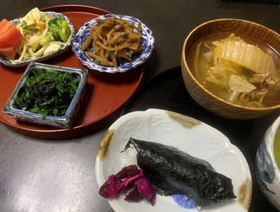 朝ごはんは、昨夜のお残りばかりほうれんそうの黒ゴマ和えも。