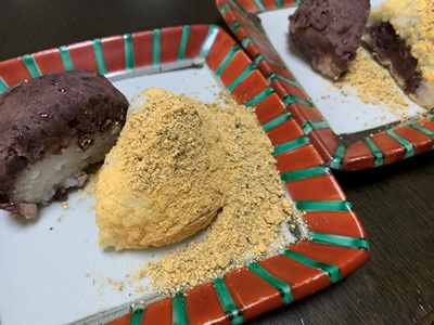 黒豆きなこをかけて、お供えしました。子どものころ歌っていました。♪おはぎがお嫁にいくときは、あんこときなこでお化粧して、丸いお盆に乗せられて着いたところは口の中。