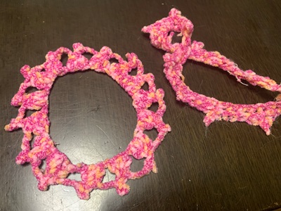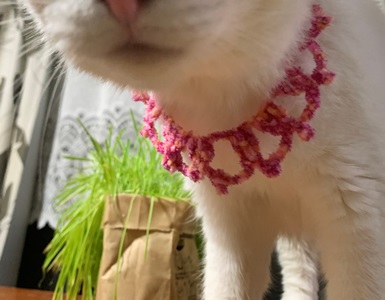 ★シロップ、首輪に手を通してたすきがけになっていました。締め付けるといやだろうなと思ってゆったり編んだのですが、よくありませんでした。伸びないように、編み方を変えました。