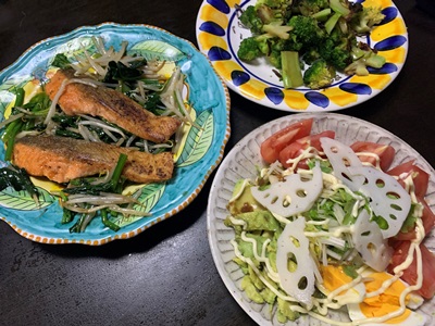 玄米入りのごはん、もうじき炊けます。サーモンは、フライよりバタ焼きがいいとうーががチョイスしてくれたので、カリカリに焼きました。焼き汁で、ほうれん草ともやしを炒めました。サラダのメインは、アボカド。トマト、セロリ菜、ゆでたまご、そして飾りの酢レンコン。運びながら、うーががよろこんでくれます。「サーモン、カリカリで、おいしそう」「サラダにアボカド、入れてくれたんや」「ブロッコリー大好き」「お野菜いっぱいやね」。矢継ぎ早にうーがは、言葉の花を咲かせます。「ばーば、ビール飲む?」「昼間飲んで来たから、パスする」「そうだったね。おなかいっぱいやのに、うーがのためにこんなにこさえてくれたん? ありがとう」。うーがの言葉は、人を幸せにしてくれます。