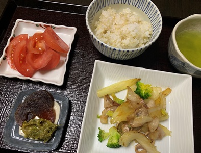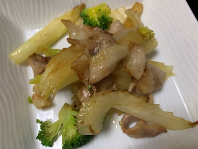 ★今朝のごはんは、セロリとバラ肉を炒めたん。しょう油の焦げたいい匂いが食欲をそそります。