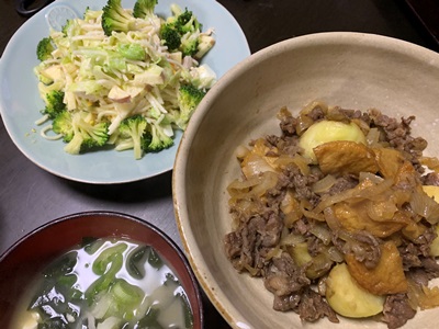 ★夜は肉じゃが。平天も入れました。新じゃが、新玉、甘くて、ほっこりおいしいです。細切れは、まとめ買いして、小分け冷凍しています。パスタサラダのパスタは、昼間茹でたうどんの残り。意識して多めに茹でました。チキンと春キャベツ、りんご、ブロッコリーがが入っています。