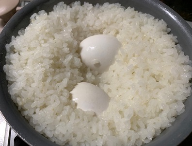 ★鍋でごはんを炊くと、沸騰してから弱火で10分で炊きあがります。八分搗きもふっくらと。弱火にするときに、たまごを入れておくのは恒例になりました。茹でたまごがあると、重宝します。