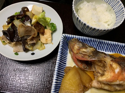 キャベツ、玉ねぎ、豚肉、豆腐、ネギと炒めました。