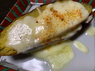 ★おさがりの焼き芋にチーズをかけて、チンしました。グラタンみたいでおいしかったのですが、朝ごはんには少し足りません。