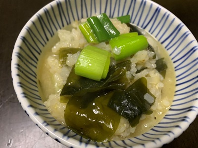 残りのみそ汁に九条ネギと天かすを入れて、おじやにしました。