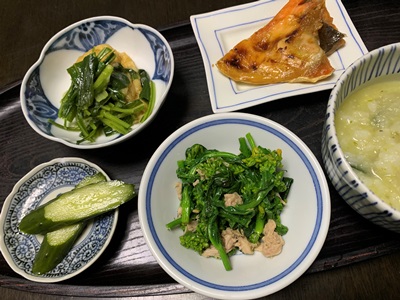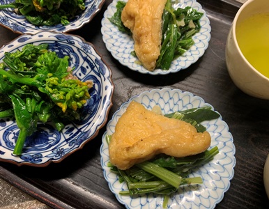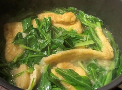 ★壬生菜にも、菜の花のような花芽がついています。油揚げと炊きました。壬生菜は京野菜の一種類のようです。包装セロファンに「壬生菜」と表記してあるので、壬生菜と料理していますが、のらぼうも、小松菜もみんなよく似た、菜っ葉の炊いたんです。
