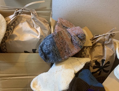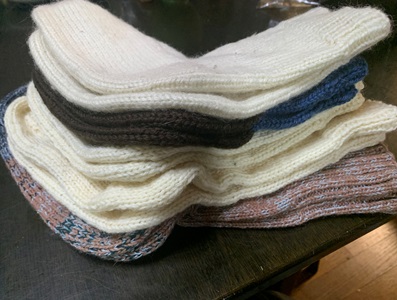本に登場していただいた息子さんが、「お米といっしょに送ってあげたら」と言ってくださったそうです。北海道の寒さにも耐えるように、ウールでしっかり編んであります。サイズはいろいろありますが、それも足にフィットします、手編みのよさです。大切に履かせていただきます。