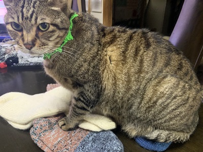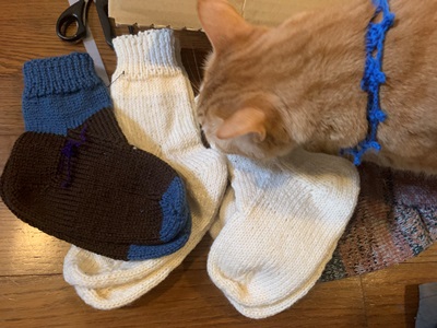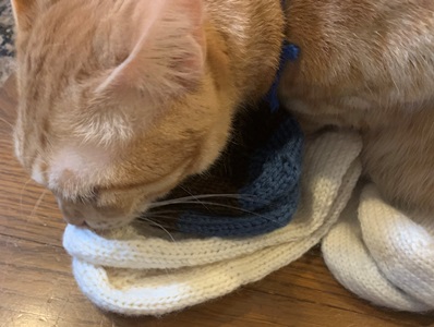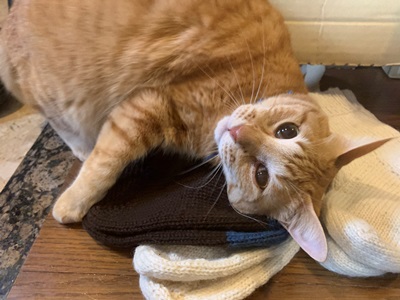 岡崎さんのお宅には、現在ねこちゃんは8匹いるそうです。あんどらが毛糸の靴下にすりすりしているのは、北海道のお友だちの気配を感じているのかもしれません。会いたいなって。