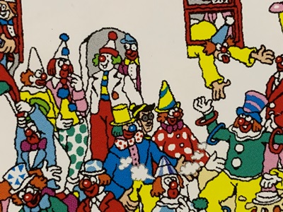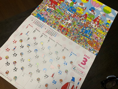 ★「ウォーリーを探せ」のカレンダー、今日からは4月。新しい画面に替えなければならないのですが、3月の中で、どうして見つけられない人物がいます。29日のオドロ(ブルーの服と帽子とめがねのウォーリー)です。見つからないままでは4月に進めないとうーがに訴えたら、探してくれました。
