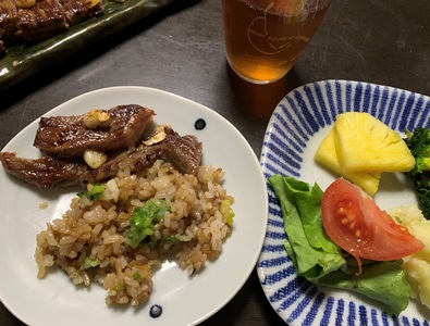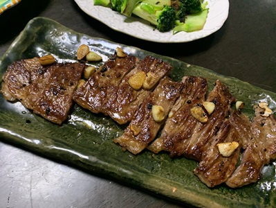 ★火曜日のことです。雨上がりの夕方、一乗寺のHELPの前を通りました。ハムを買っておこうと思い店内に入ったのですが、和牛のステーキ肉が半額になっていました。半額なんて、めったにありません。めげずにがんばっているうーがに食べさせてやりたいと思って買いました。その日も、次の日も、うーがとわたしの夕飯のタイミングが合わなくて、やっと今日、焼きました。「こんなごちそう、いいの? ばあば」と心配そうなうーが。大丈夫、半額だったから。