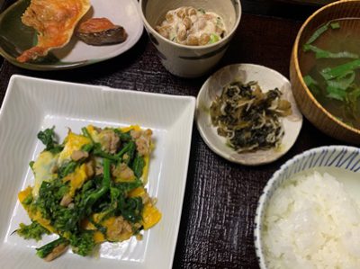 菜の花とシーチキンの残りは、たまごで綴じました。