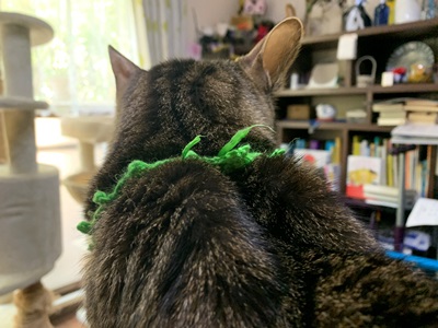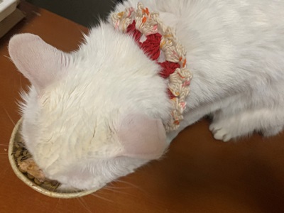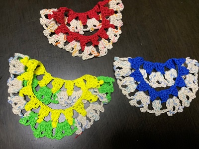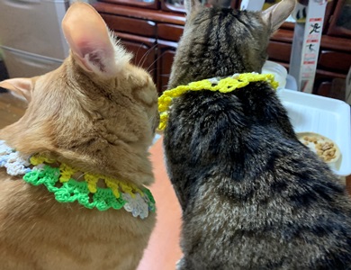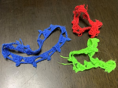 ★ねこたちの首輪、嫌がらないようにゆるく編んでいるせいもあるのですが、糸を替えても、一重ではすぐに伸びて、よれよれになることがわかりました。