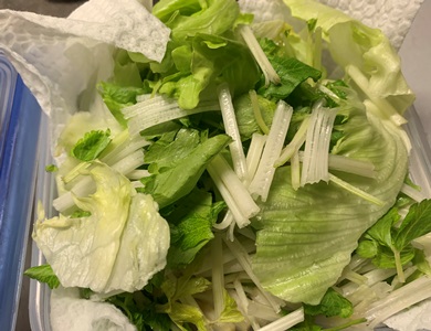 レタスとセロリ菜は洗って容器に入れておきました。うーがが自分でサラダをこさえるための時短です。今朝は、トマトを足し、ハムエッグをこさえて食べていました。