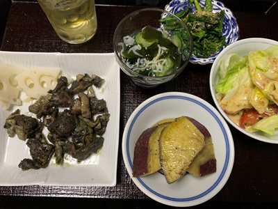 ★朝、昼につづき、夕はんも手抜き。ストックおかずをお皿に盛っただけ。