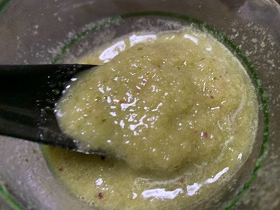 ★冷凍しておいたスムージー、少し溶かして、ミキサーにかけ直しました。たぶんリンゴとバナナとケールだと思います。とろりと冷たくておいしいです。