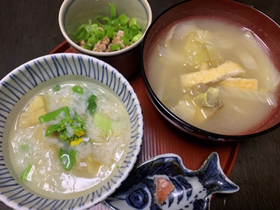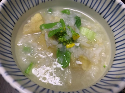 さつま芋の炊いたんでおかゆをこさえました。菜の花は、