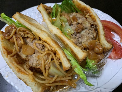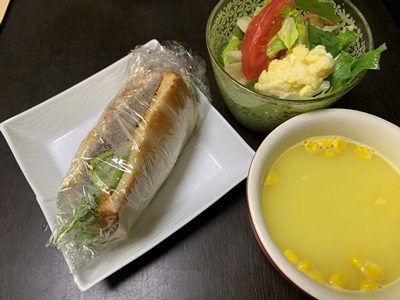 ★昨夜のお残りのハンバーグは、ト―ストした食パンで挟んで、サンドイッチにしました。すごいボリュームになったので、半分はお昼に回しました。