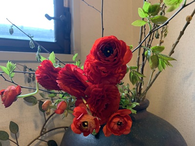 ★お隣さんから、緑の枝が届きました。添える花を散歩がてら買いに行きました。昨日のことです。真っ赤な花は、ラナンキュラス。