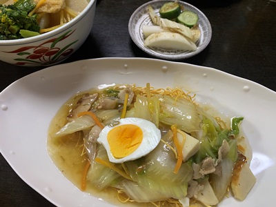 ★夕はんは、あんかけぞば。色彩的にも、エビを入れたかったな。せめて、かまぼこはピンクにしたかった……。そうか、カニカマなら、両方かねることもdきたし、コンビニでも買えたのに。