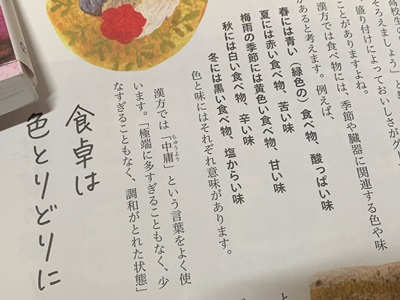 緑色の食材は肝を養い、目の疲れやイライラを和らげるとされます。赤い食材は心を養い、血液循環を促し、精神を安定させる働きがあるのです。黄色い食材は脾を養い、消化機能を高めエネルギーを補います。白い食材は肺を養い、呼吸器を潤し、免疫力を高めるとされるのです。黒い食材は腎を養い、生命力を蓄え、老化を遅らせる働きがあるそうです。要するにバランスよく耐えなさいということでしょうか。そして、旬の食べ物も、体にいいそうです。