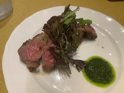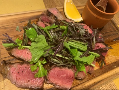 雨で冷え切った体に熱々のニンジンスープは、最高です。オリーブで香ばしく焼いたフオッカチャ。大原野菜のサラダとフリータッタ。タコと新玉のパスタ。そして、評判のイタリアンステーキ。