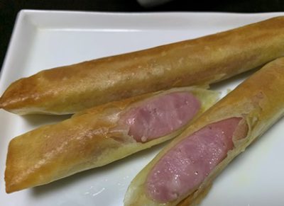 残っていた春巻きの皮で、ソーセージをまいて、揚げ焼きに。