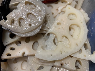 ★酢レンコンを、こさえました。今回の酢レンコンは、色が冴えません。しっかり水にさらしてからゆでたのに、真っ白には仕上がりませんでした。芯も硬そうで、質が良くないようです。右側の大きなレンコンは、前のものです。