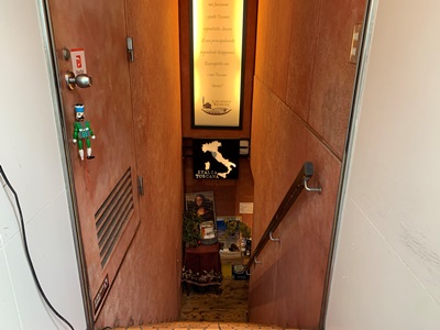 人がひとり、やっと通れるほどの細くて急な階段を、降ります。
