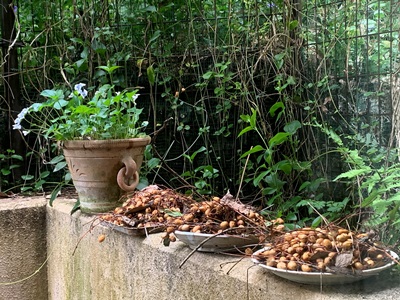★栴檀の実が、ベランダを埋めています。ヒヨドリが啄みに来るので、掃き集めて盛りました。今年は、すでに一か月ほど前にヒヨドリの集団が来ていたのですが、その時はまだ、栴檀の実は落ちていませんでした。