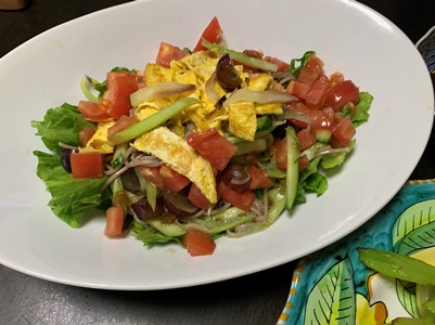 ★ハードスケジュールをこなして疲れた上、おなかがぺこぺこで帰って来るうーがのための夕はんのメインは、のど越しのいいソバサラダ。茹でた乾麺の上に、セロリ、キュウリ、みょうがの細切り、トマト、うすやきたまごをのせて、そばだしを酢で割ったものをかけました。