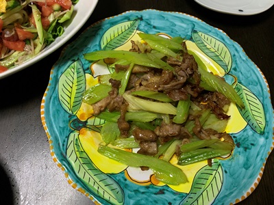 下味をつけ片栗粉をまぶした豚肉は、セロリと炒めました。