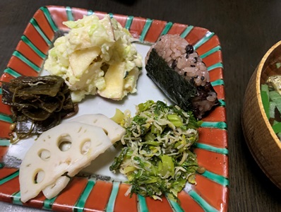セロリの葉の佃煮とポテトサラダ。昆布の佃煮。