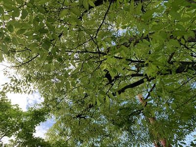 新緑の中で一羽のカラスが鳴いていました。どこだ?
