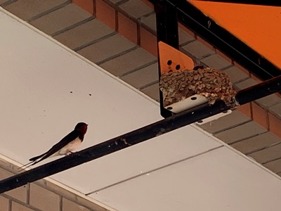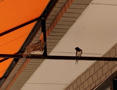 ★巣の中の伴侶を、見守っているやさしいつばめ。今年初めて見ました。「いっちゃんラーメン」さんの軒下。巣が落ちないように補助されています。店主さんもやさしいです。
