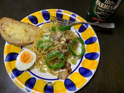 ★出かけていくうーがの朝ごはんはパスタ。スケジュールがびっしりのうーがに、おべんとう(といっても鮭と塩昆布のおにぎりとたまご焼きだけ)を持たせました。
