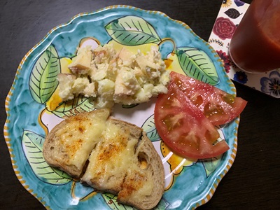 ★うーがの、朝ごはんは、パン食。ご近所さんが届けてくれたパンに、チーズをのっけて焼きました。香ばしくっておいしいそうです。