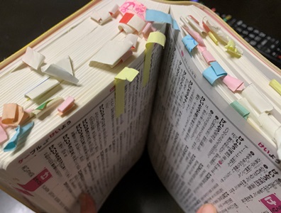 辞書を開いて、知っている言葉を見つけたら付箋を張っていくそうです。