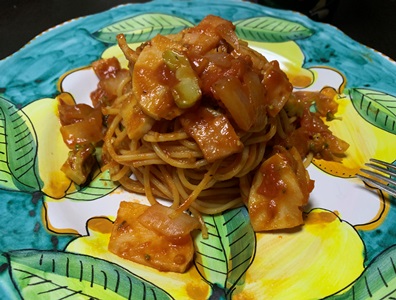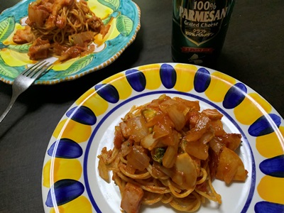 ★ナポリタンをこさえました。炒めたトマト、玉ねぎ、ハムをケチャプとトマトジュースで煮込んで、味付けをし、仕上げに竹の子とブロッコリーの刻んだんを入れて、すぐ火を止めます。あとは茹でたパスタを絡めるだけ。