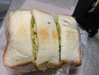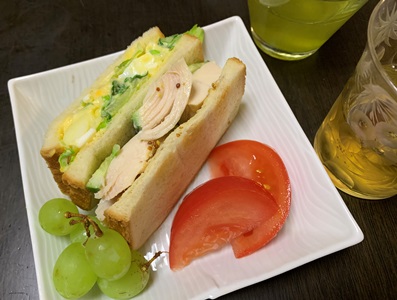 カレンダーを5月に替える今日になって、気づきました。BLサンドは素材がないので無理でした。もうひとつのチキンとたまごサラダなら、サラダチキンがあるのでできるかも。食パンはトーストしました。炒りたまごの代わりにポテトサラダを挟んだのでけっこうなボリュームです。カレンダーのサンドイッチとは違うものになりましたが、わたしなりにけじめは付きました。