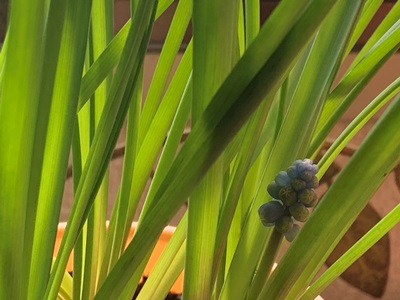 ★これって、もしかしたら? ムスカリと同じ葉っぱです。並べてみるとやっぱり。思い返せば、何年も前に花の終わった球根を、ここに埋めたかも。 おひさまを浴びて輝いているムスカリの花。じゃがいもの芽にも光を。 それにしても、光の届かないキッチンで、真っすぐよく伸びたものです。 ついで…